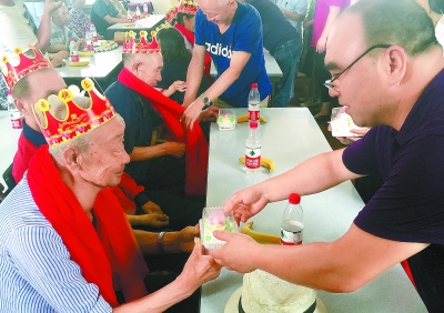 每月为当月过生日的老人们集中举办生日会,老穆一一为老人们送上蛋糕。