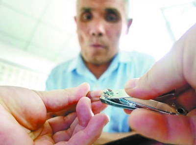 趁着老人看电视,工作人员为唐所柱老人修剪指甲。