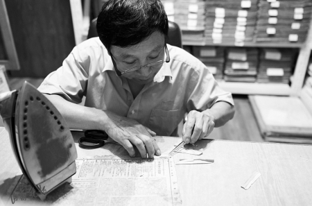 王海勇用熨斗、剪刀、镊子、胶水配以他用茶水浸泡后的纸张,修补着一份百年前的残损报纸