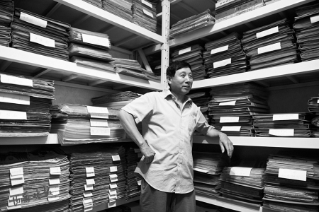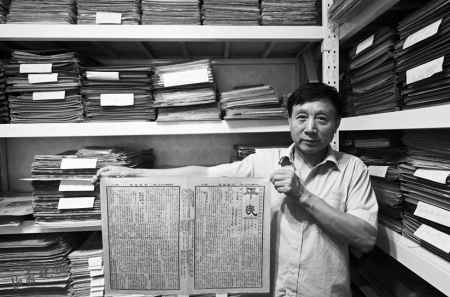 8月10日,太原市红沟路一处普通宿舍区的一间平房内,63岁的王海勇伏在桌上,用熨斗、剪刀、镊子、胶水配以他用茶水浸泡后的纸张,修补着一份百年前的残损报纸。靠墙的架子上整齐地摆放着从清代到当代不同种类的报纸,由地面一直延伸到房顶,一摞摞分类整理的报纸用标签区标注着时间,也标注着一个个辉煌的历史节点。这间陋室就是王海勇的“三晋藏报馆”,这里收藏有六千三百多种、超过三万份报纸,除了清代、民国报刊,还有解放前红色报刊,建党、建军特刊,以及香港回归、澳门回归等重大事件的特刊、号外等14个大类。
