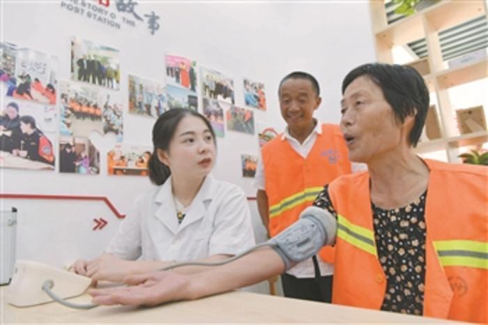 图为8月15日,医务人员到爱心点为环卫工人测量血压。 新华社记者 彭昭之 摄