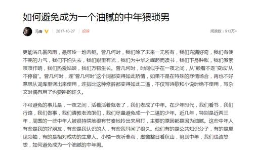 有意思的是,在《如何避免成为一个油腻的中年猥琐男》掀起一阵网络狂欢后,冯唐也遭到网友群嘲:中年男性写此类文章,其实是自夸和自我感觉良好,而这正是油腻的源头之一。