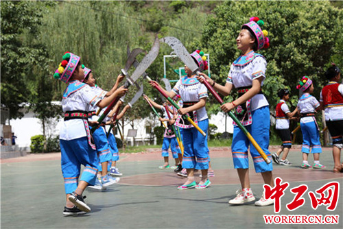 大山深处的篮球场上,云南省大理州漾濞彝族自治县鸡街乡中心完小的20多名四、五年级学生穿着民族服装,手持齐个高、带把的大刀,脸上挂着笑,列好队形,在一段彝族音乐带动下有节奏地跳着。