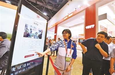 志愿者正在帮参观者操作恢复高考年的“准考证”拍摄生成