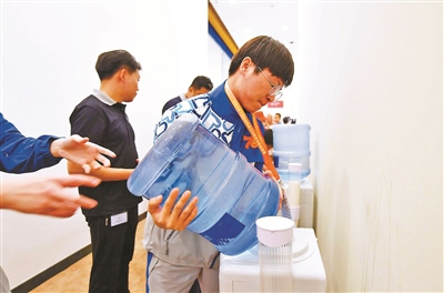 男生志愿者在饮水点挑大梁,换水不含糊 本版摄影/本报记者 袁艺