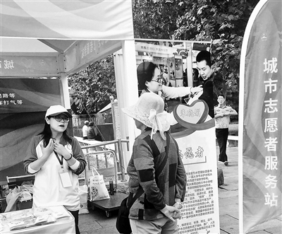 “您好,请问您需要帮忙吗?”一位头戴白色鸭舌帽的女子在城市志愿者服务站前,热心询问着过往市民。北青报记者了解到,这名女子名叫朱晓娟,在北京市京密引水管理处工作。为了响应中华人民共和国成立70周年庆祝活动志愿服务,朱晓娟积极为市民提供便民服务。