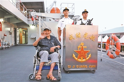 戚继光舰领导得知消息,决定为这位耄耋老华侨破例一次。4位年轻学员主动上前抬起轮椅,带老人登舰参观。轮椅停在飞行甲板上,老人久久凝望着军舰,用客家话颤抖地说:“祖国强大了,我真的很高兴!”