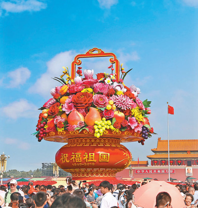 十月二日,以花果篮为主造型的中心花坛亮相天安门广场。花果篮寓意新中国成立七十年来成就硕果累累,表达对祖国的热爱和祝福。图为花坛扮靓的天安门广场游人如织。本报记者 贺勇摄