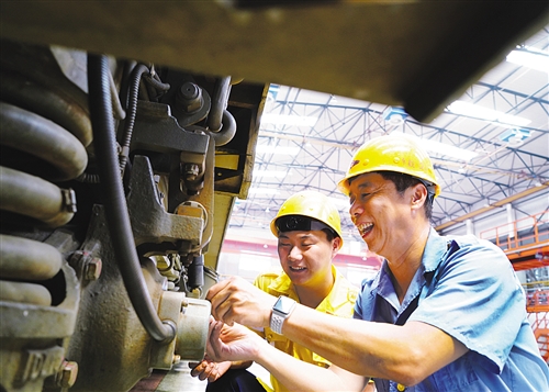 ▲北京铁路局北京西电务段丰台车载设备车间首席技师王振平(右),认真钻研业务,填补了和谐机车车载设备理论上的空白,先后获得全路职业技术能手、铁路工匠等荣誉。本报记者 翟天雪摄