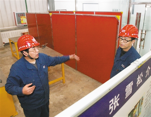 中车唐山轨道客车有限责任公司铝合金厂高级技师、数控装调维修高级技师张雪松(左),参与了复兴号动车组铝合金车体生产线的自动化、智能化改造。工人日报记者 杨登峰摄