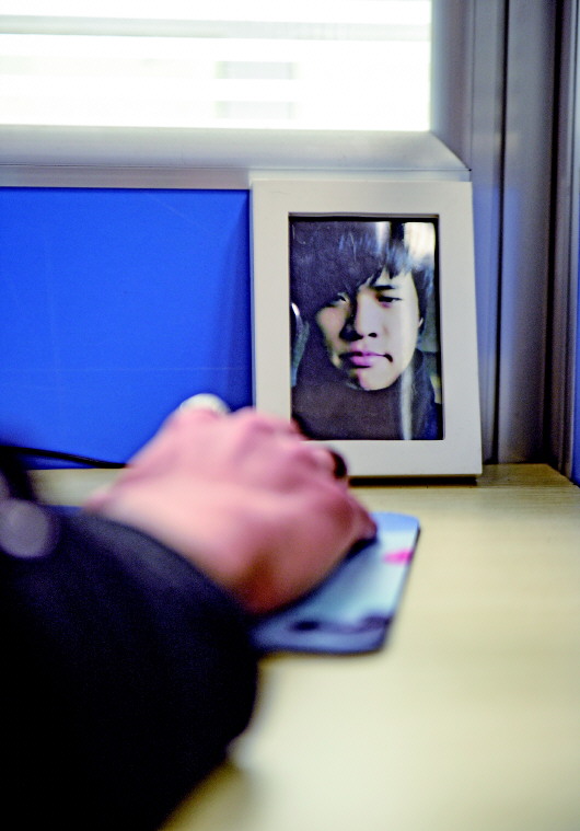 虽然吐字不清,25岁的李佳却能准确表达所感所思。在他的办公桌上,一张自拍照充满自信,敲击鼠标的手指上还带着时髦的指环。
