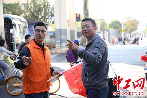 上海地铁1号线中山北路站距上海火车站仅一站,有三个出入口,其中1号和2号出入口临近高架,同时又是一个丁字型大路口,往来人流、车流汇聚于此,交通安全压力较大。来自中铁四局上海公司的志愿者们需要分时段在附近三个路口执勤,维护交通安全,张高尧的工作就是文明出行劝导和提供道路指引服务。