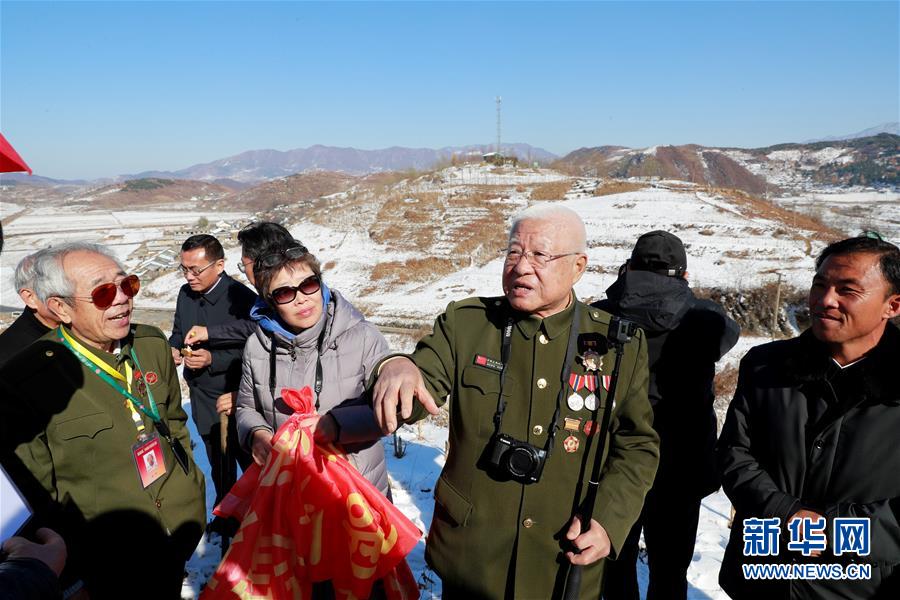 11月15日,在朝鲜平安南道价川市,志愿军老兵曹家麟(前右二)与陪同的价川市人民委员会副委员长黄炳植(右一)等登上松骨峰。新华社记者 程大雨 摄