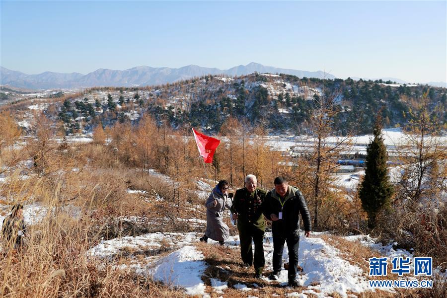 11月15日,在朝鲜平安南道价川市,志愿军老兵曹家麟(中)向松骨峰主峰攀爬。新华社记者 程大雨 摄