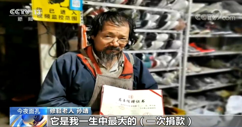 修鞋老人 孙靖:这么一笔,它是我一生中最大的一次捐款。我这个年龄,我知道,贫穷的滋味很难受。