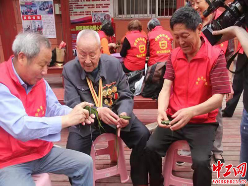 今年端午节前,张志光(右)与92岁的抗战老兵刘锡昌与爱心志愿者一起包粽子,送给抗战老兵和孤寡老人。