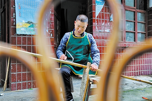 杨秀刚正在分割竹子。做竹篾制品很复杂,要裁料、剖竹、剖篾、剖丝篾、编织。小小的竹篾品看似简单,编制起来颇费功夫。