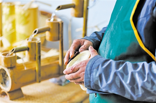 杨秀刚对竹艺制品进行打磨。从山上砍下来的竹子,要先阴干再浸泡,进行防蛀、防霉、防裂处理,之后才是合格的竹编材料。
