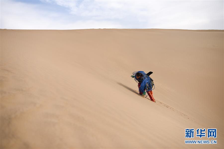 遇到沙漠摩托无法到达的不正常桩号点位,查线工周福香只有背着电缆徒步前行(1月15日摄)。 新华社记者 丁磊 摄