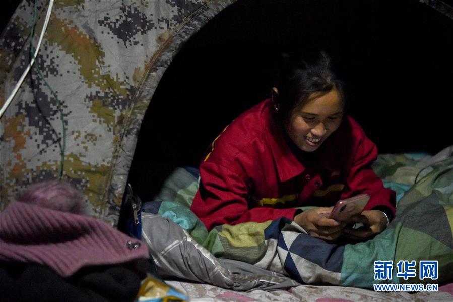 晚上在帐篷中,查线工周福香翻看手机中孩子的照片(1月15日摄)。 新华社记者 丁磊 摄
