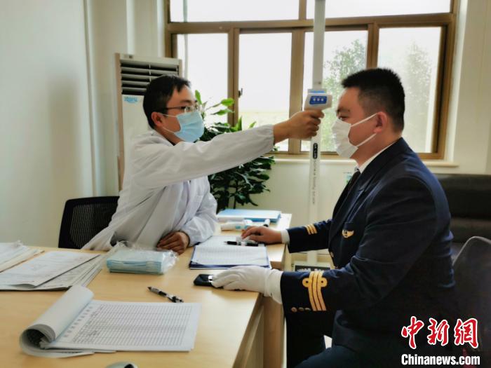 茹毅给航班人员进行体温测量。杨帅 摄