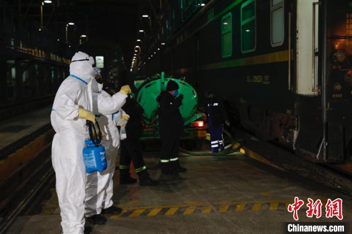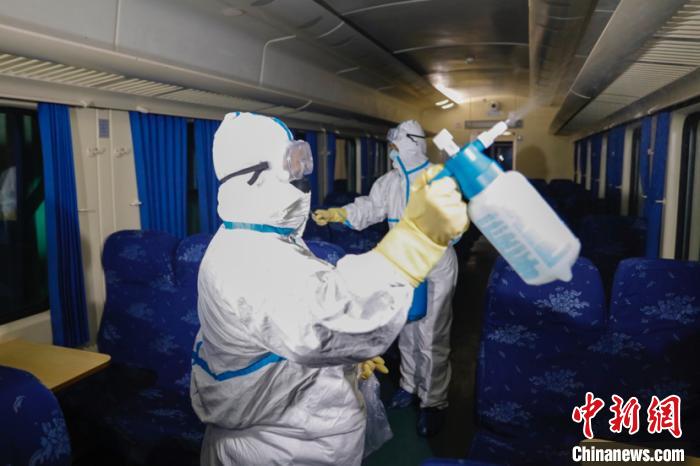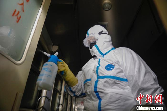 列车车厢里人员密集,流动性大,跨越地区多,容易滋生细菌。特别是近期疫情形势严峻,列车消毒增加了频次,现在工作量是以往的两倍以上。张强和搭档每天要工作近6个小时,对40多组列车消毒,常常要工作到夜里12点。