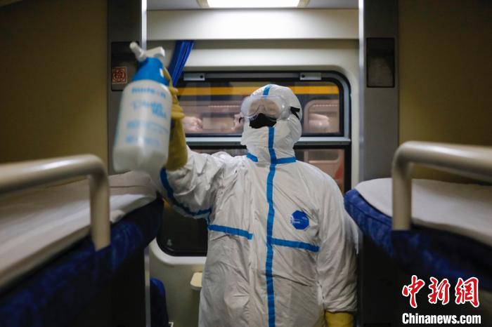 “我们调配使用的是含氯消毒液,能有效杀死冠状病毒,除了列车上的卫生间、洗面间、门把手等关键区域,还要对空气消毒,让消毒液附着在空气中的病毒上,达到消杀的目的。”张强精准地配比着消毒药剂,然后举着喷壶,对着空气喷洒了一圈。