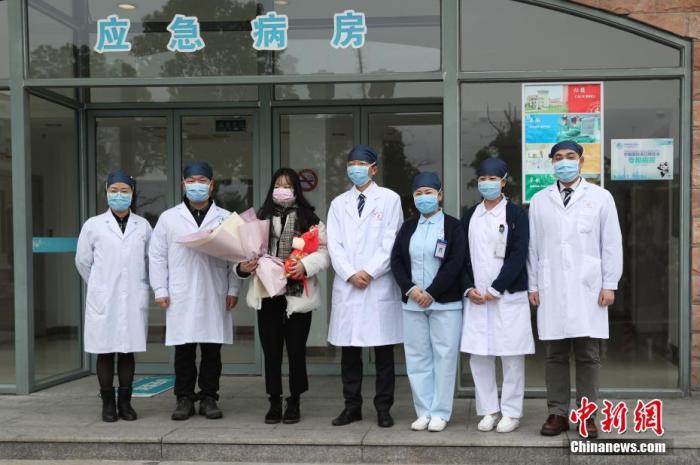 上海一名新型冠状病毒感染的肺炎患者痊愈出院。图为患者(左3)痊愈出院与救治医生合影。中新社记者 张亨伟 摄