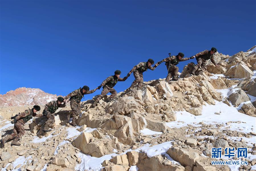 1月24日,新疆军区河尾滩边防连官兵手牵手向巡逻点位前进。 新华社发(王向阳 摄)