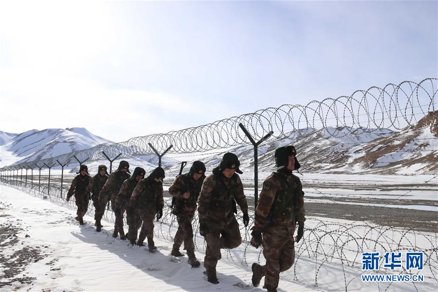 1月24日,新疆军区河尾滩边防连官兵察看边防设施。 新华社发(王向阳 摄)