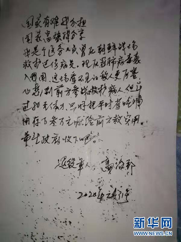 和3万元捐款一起交给村委会的,还有老人手写的一封信,他在信中说:“国家有难我分担,国家富强我分享……心想到前方参战救护病人,但年过80无体力,只好把平时省吃俭用存下的3万元献给前方。”