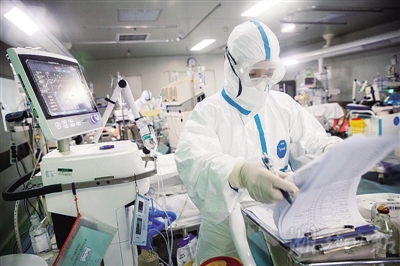 1月28日,武汉肺科医院,医护人员在ICU(重症监护病房)内检查重症患者的病例。柯皓摄/光明图片