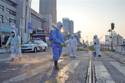 2月4日,湖北省中医院门口,环卫工人进行消毒作业。蔡俊摄/光明图片