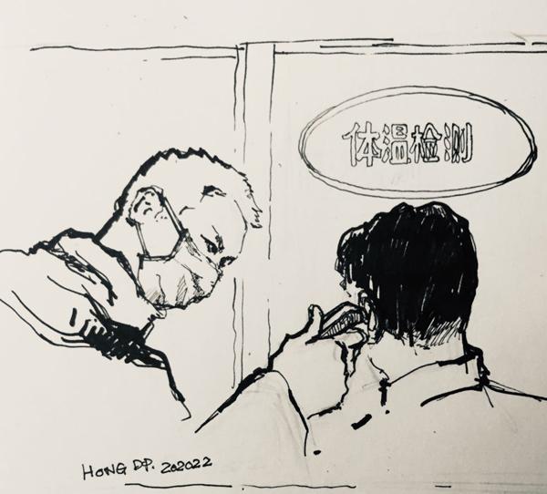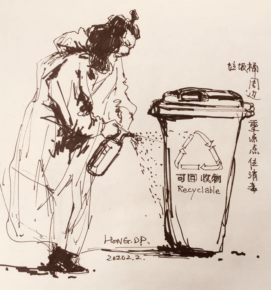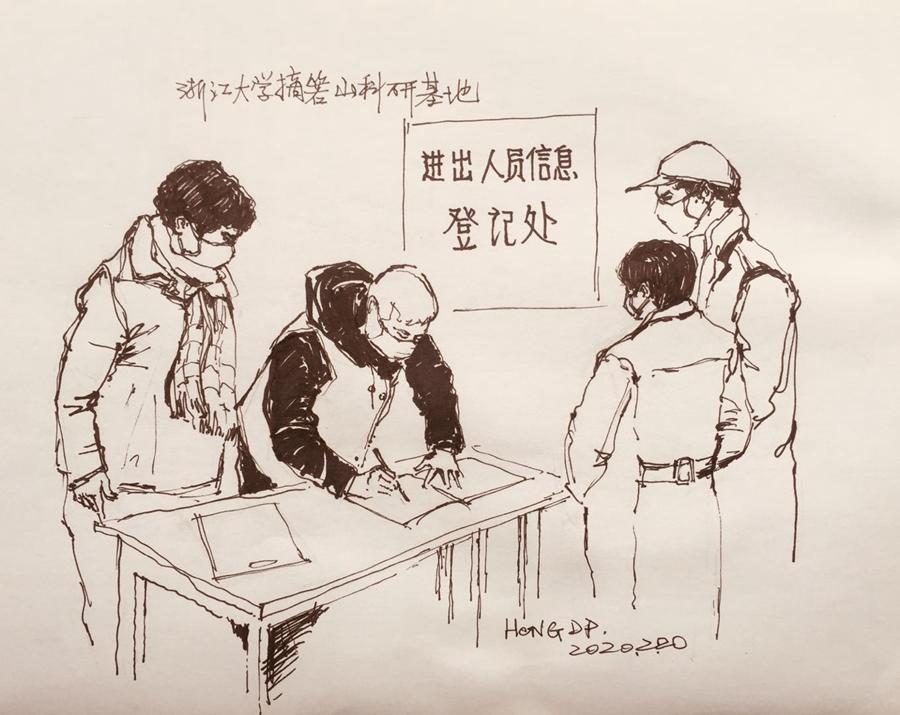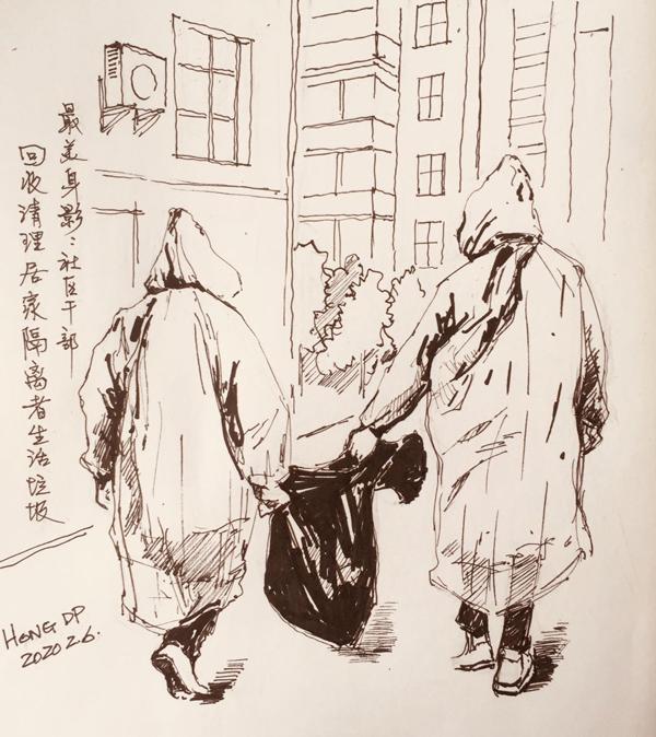 抗击疫情以来,人员排摸、体温检测、杀菌消毒等工作场景大家早已司空见惯,这些熟悉的场景被定海区退休职工洪道平用速写的方式记录下来以后,却带给人们别样的感动。洪道平说:“我们可以用多种途径来声援、来驰援这个抗疫斗争,作为手绘,我们也可以表现一下他们基层一线工作人员一些辛勤的付出。”