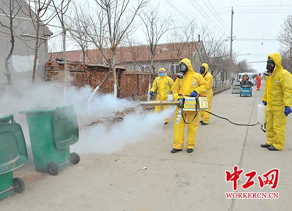 在大家洼街道余粮村,6名队员装备齐整、防护到位,他们两人一组,密切配合,一会儿驾驶电动三轮车沿村路进行消杀;一会儿行走在村路上,对沟渠和垃圾箱定点消杀。