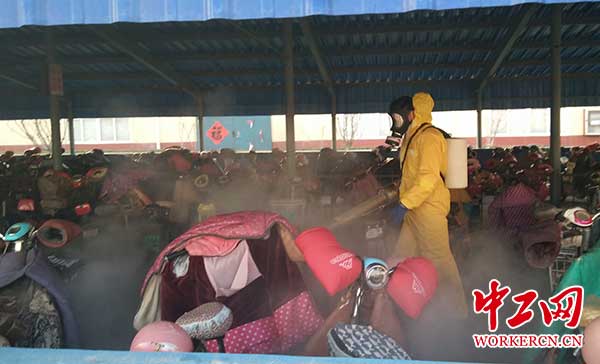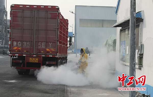 连日来,李福山队长带领队员们佩戴防护服、防护面罩,携带两台弥雾机为公司本部办公大楼、纯碱厂新老线办公大楼、纯碱厂新老线中央控制室、纯碱厂新老线食堂、小苏打厂区、塑编厂区等进行全面消毒防疫,每天消毒面积约9万平方米。
