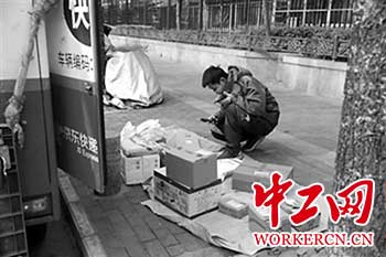 2月12日,一名快递小哥在一处小区外分拣快递。工人日报—中工网记者 王伟伟 摄