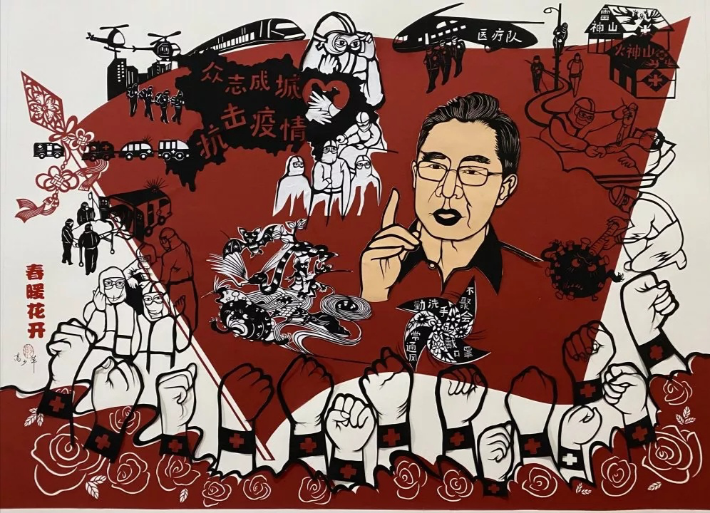 中工网讯  新冠肺炎疫情来袭,全国人民迅速掀起一场万众一心、众志成城的人民战争。有人在一线战“疫”,逆行救援;有人坚守岗位,守护一方平安;有人捐款捐物支援疫区……每个人都在用自己的方式为抗疫出力。在福建省漳州市,全国五一劳动奖章获得者、剪纸艺术家高少萍被广大医务工作者等“逆行勇士”驰援湖北疫区行为感动,创作了以“众志成城、抗疫必胜”为主题的系列剪纸作品致敬“逆行者”,讴歌他们心怀大爱、直面危险的大无畏精神,祝愿他们早日平安归来。同时,她还带领剪纸创作者创作了宣传疫情防控知识的剪纸作品,激励人民群众坚定信心战胜疫魔。(邵爱霖)