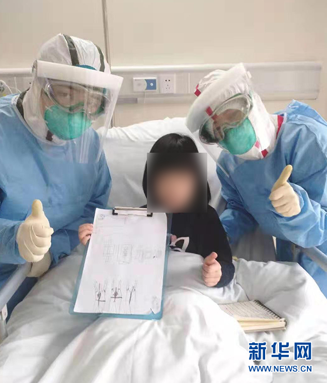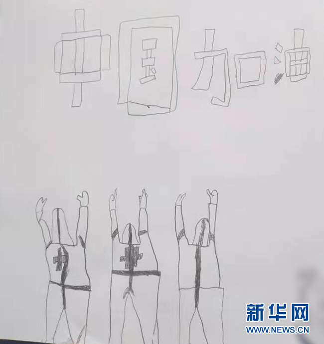 连日来,医护人员对昕昕的细心照料和治疗让昕昕的病情不断好转。看不清“全副武装”的医护人员的模样,昕昕便用铅笔画下了带给她安全和温暖的“大白”的背影——三名“大白”高举双臂,比出胜利的手势,上面写着“中国加油”。