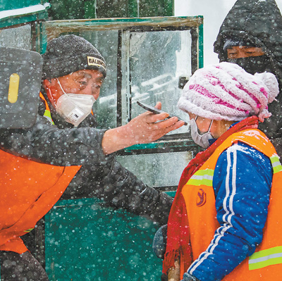 2月14日,内蒙古阿鲁科尔沁旗,工作岗位上的环卫工人堵凤琴(左二)接到远在浙江的女儿电话,女儿嘱咐她注意保暖。张 枨 李忠慧摄影报道