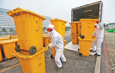 2月22日,湖北武汉,来自南京市医疗废物集中处置中心的专业人员在转运医疗垃圾。环球时报记者 崔 萌摄