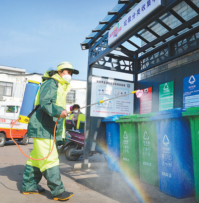 2月10日,江苏省太仓市双凤镇环卫工人对垃圾分类收集亭喷洒消毒剂。计海新摄(影像中国)