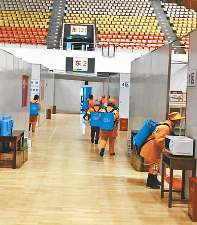 2月12日,在湖北武汉武钢体育中心青山方舱医院内,环卫工人进行清扫和消毒作业。吴 君 杜 利摄影报道