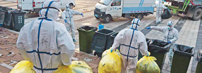 2月23日,武汉大学人民医院武昌方舱医院外,环卫工人正在清理转运垃圾。田豆豆 刘 艳摄影报道