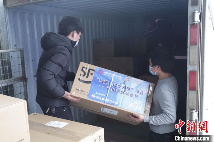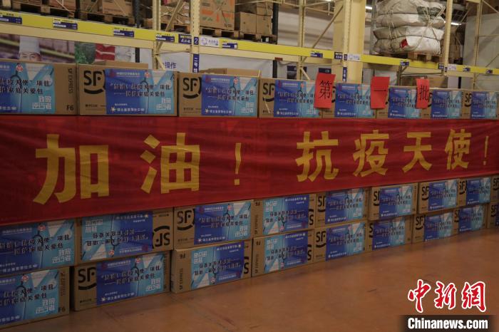 据介绍,贴有项目标识的“医护家庭关爱包”,经统一包装,整齐待发。关爱包中有米、面、油、干果、日用品等日常防护和生活物资,慰问信也将随关爱包一并包装配送。
