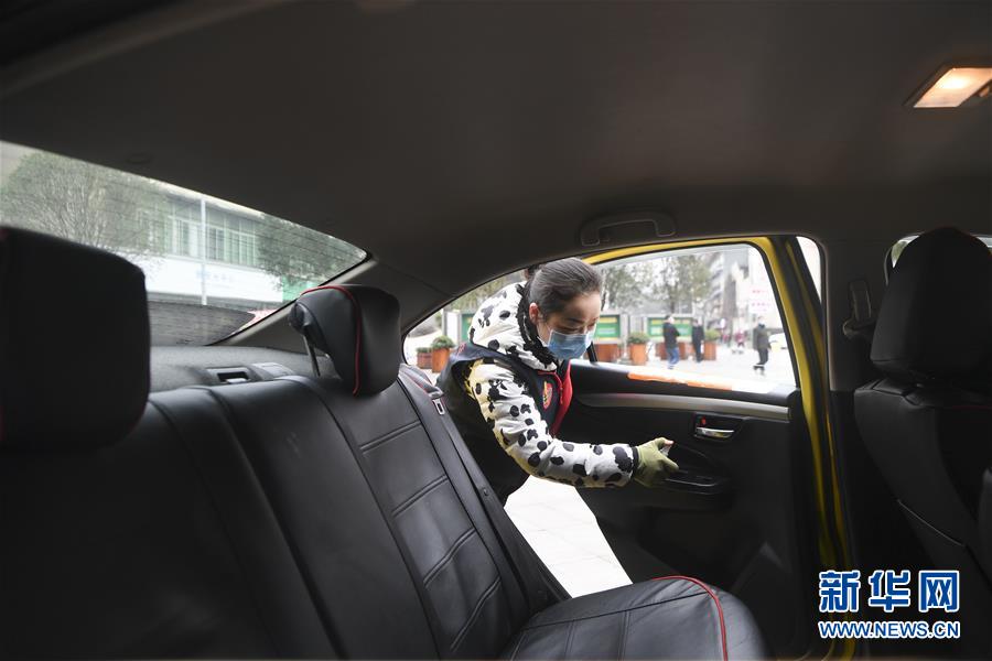 2月26日,“雷锋的士”志愿者江智琼给出租车消毒。 新华社记者 王全超 摄
