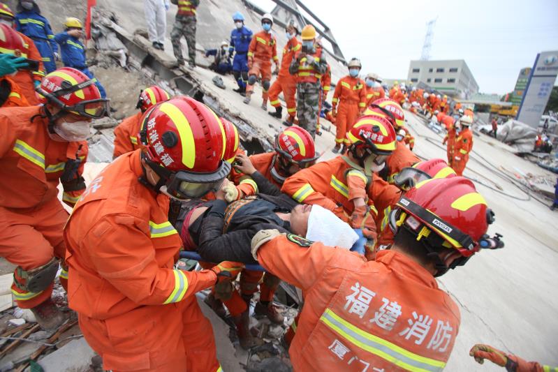 而在另一侧,厦门市消防救援支队也在对被困小男孩进行施救。救援人员利用液压顶杆将压住男孩的楼板顶起,14时许,男孩终于被救出。