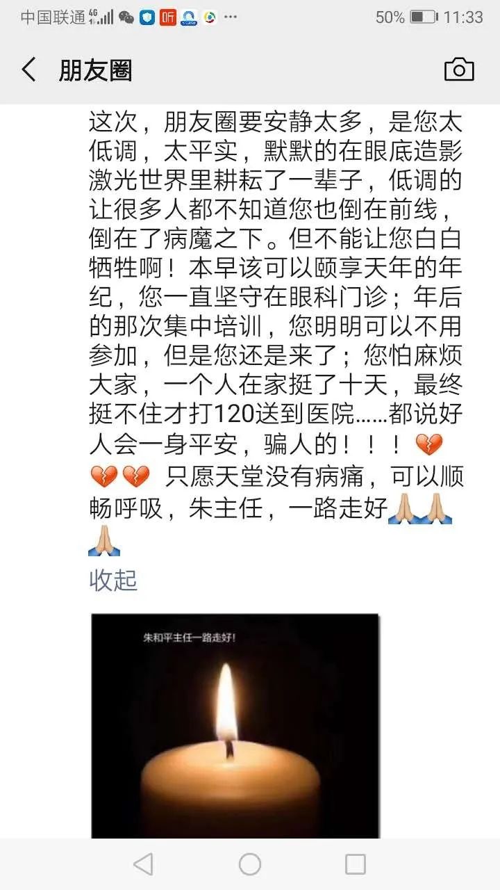 该院一名外科医生告诉记者,朱和平是退休被医院返聘到眼科工作的。朱和平于2月中旬入院治疗,9日上午抢救无效,不幸离世。