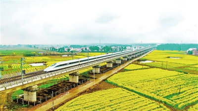 各地交通有序恢复,助力复工复产。3月1日,一列动车组在江西省吉安市万安县窑头镇八斗村飞驰。李小明摄/光明图片