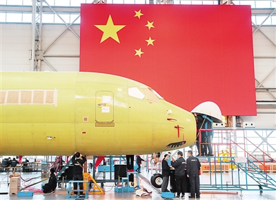 3月6日,工人在中国商飞上海飞机制造有限公司的生产车间内作业。新华社记者 丁汀摄